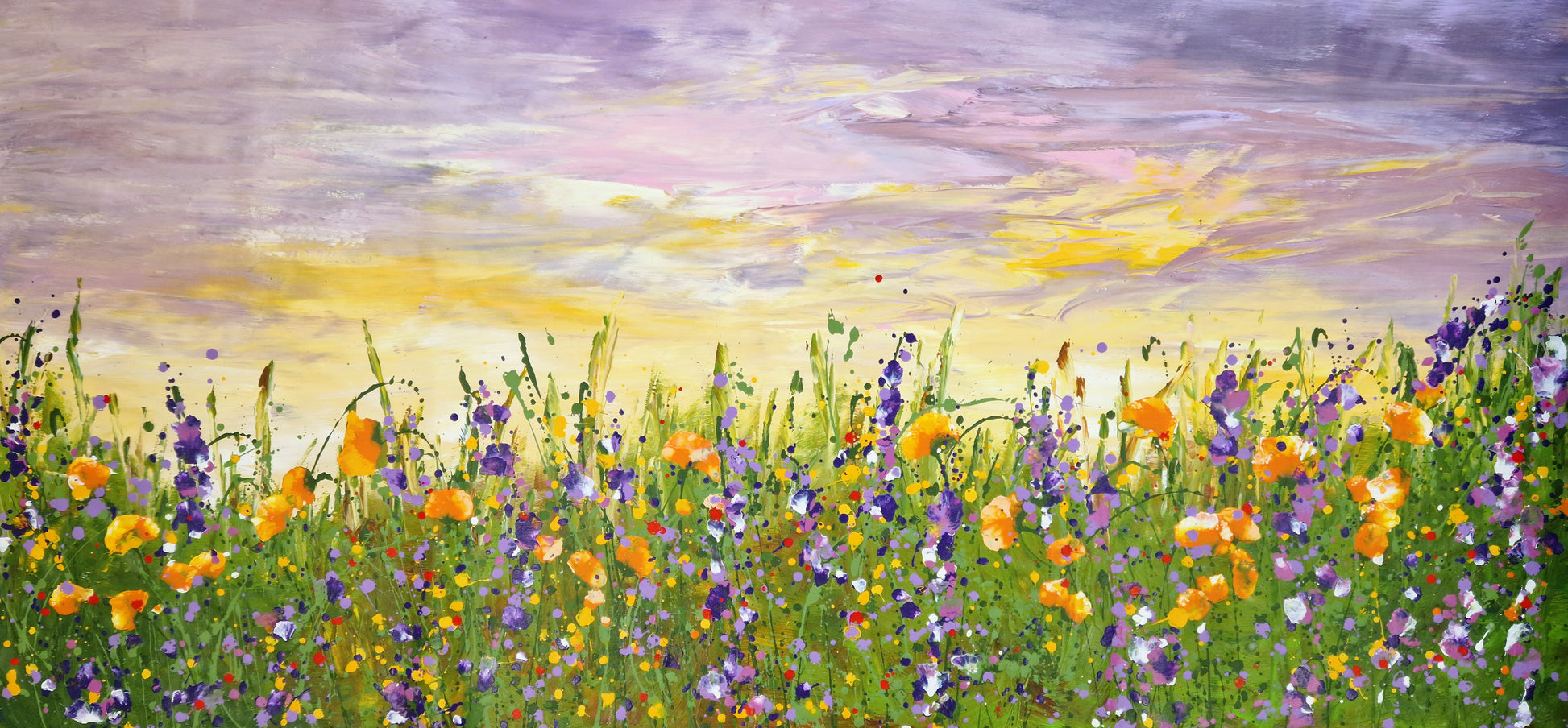 Dieses großformatige abstrakte florale Acrylgemälde vereint leuchtende Blüten in Violett-, Gelb- und Grüntönen mit einem atmosphärischen Himmel in sanften Pastellnuancen.